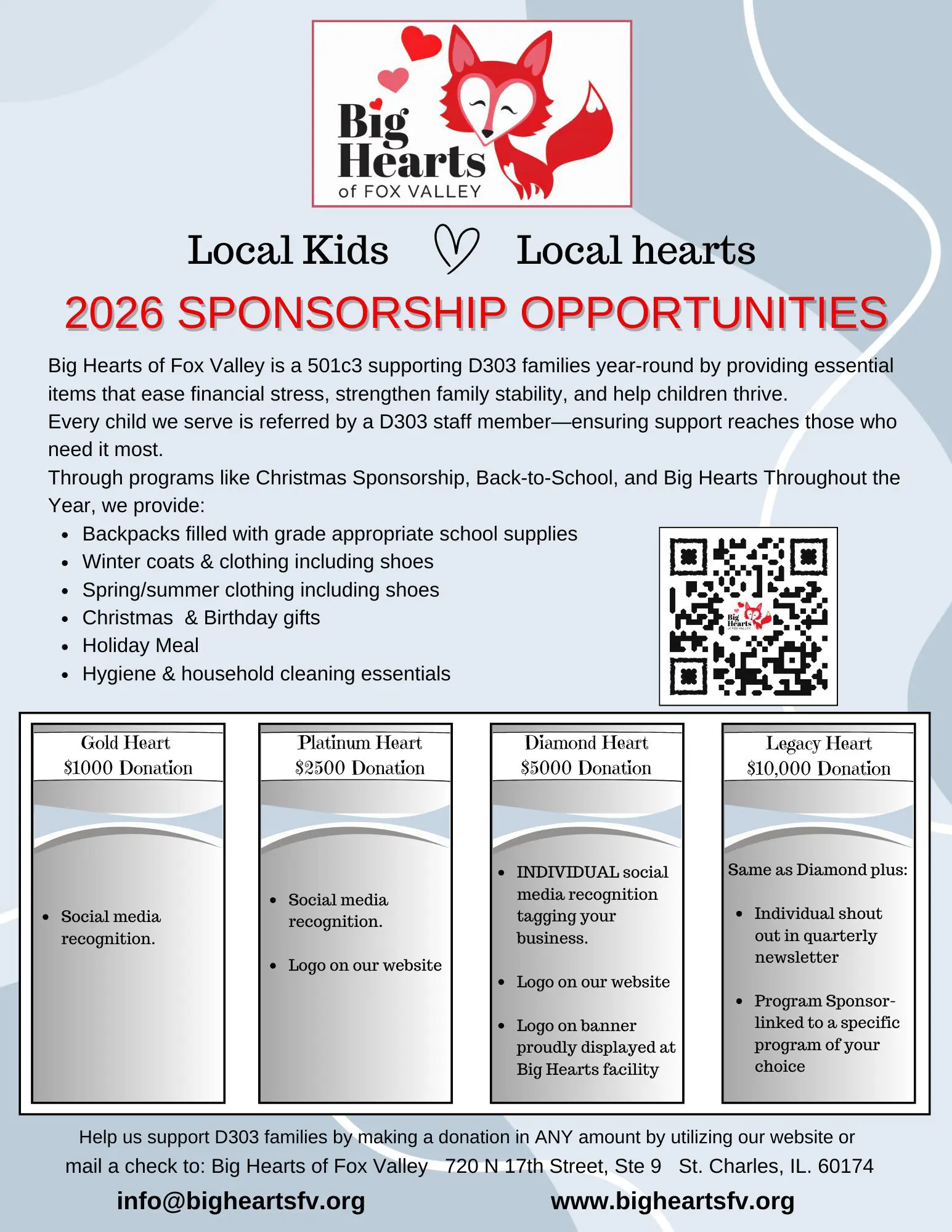 At Big Hearts of Fox Valley, we believe every child deserves to feel seen, supported, and valued—no matter their financial circumstances. Your donation helps us ease the burdens facing families in School District 303, providing critical support exactly when it’s needed most.