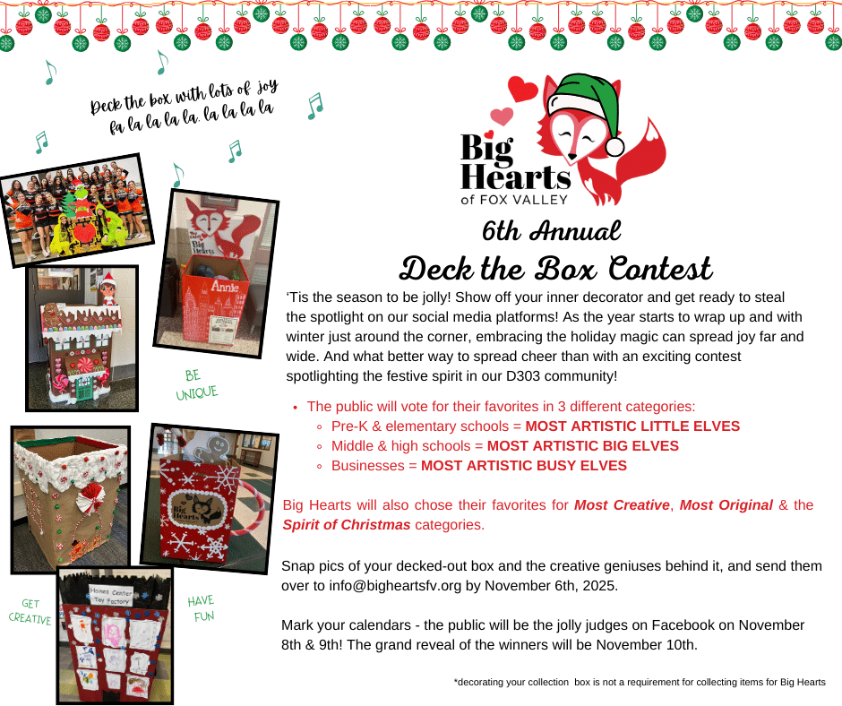 The holidays are synonymous with toys. It’s a joyous time for most, but for many local struggling families, it’s a time of stress and anxiety. Parents barely getting by still want their children to experience the joy and excitement of receiving the toys on Christmas morning. Thank you for partnering with Big Hearts of Fox Valley to help these local D303 families.